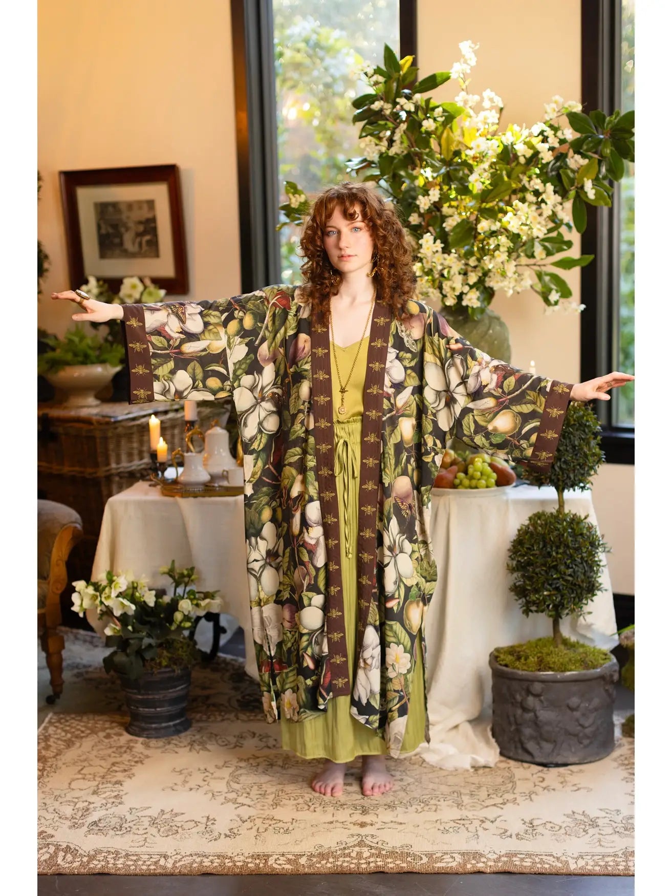 Weaving together artistry of centuries past, this opulent collection features magnolia lithographs found in 18th and 19th century natural history books from Carolina and Virginia, and hand-coloured engravings of pears and figs plucked from historic botanical prints. The delicate moths that flutter across the design — including the ethereal luna moth — come from an 1894 etching, while the little golden bumblebees on the trim are borrowed from an embossed Victorian book cover.