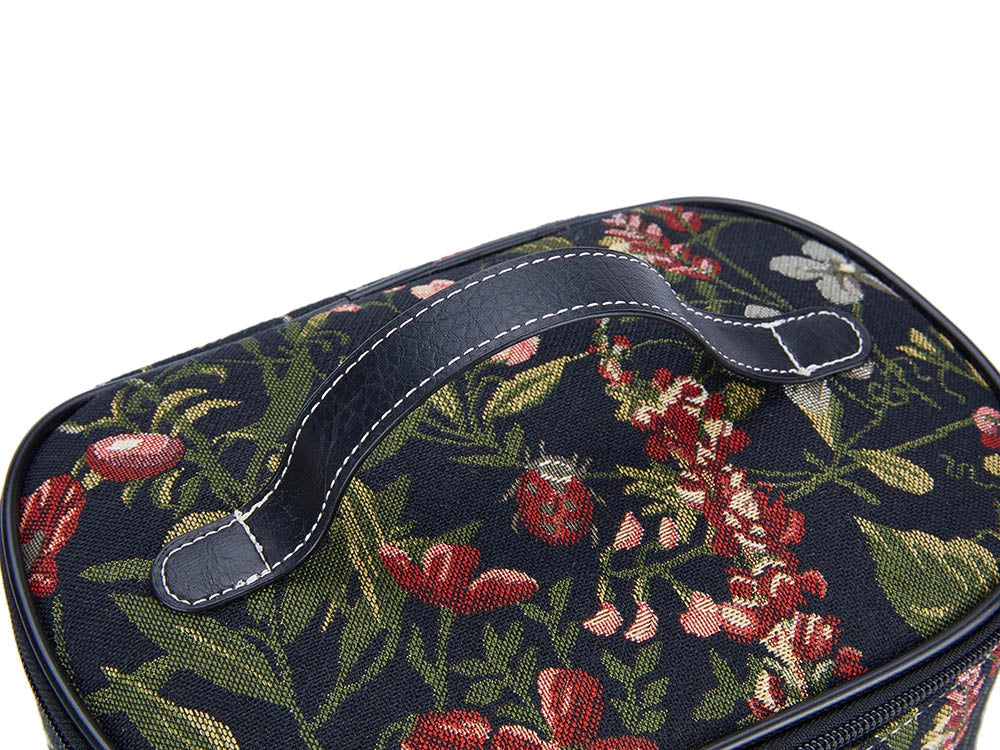 Cosmetic storage bag with zip fastened around the lid of the case.